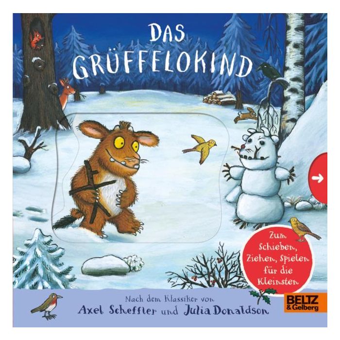 Die berühmte Geschichte vom Grüffelokind als Pappbilderbuch zum Spielen: Der dunkle Wald, so warnt der Grüffelo sein Kind, ist voller Gefahren, dort lebt die große, böse Maus. Das Grüffelokind glaubt ihm nicht und schleicht sich aus der Höhle. Mutig fragt es nacheinander Schlange, Eule und Fuchs, ob es die böse Maus wirklich gibt. Durch einfaches Schieben und Ziehen der Bildelemente können schon ganz kleine neugierige Kinder der Geschichte spielerisch folgen. Das fördert Koordination und Feinmotorik und macht großen Spaß.