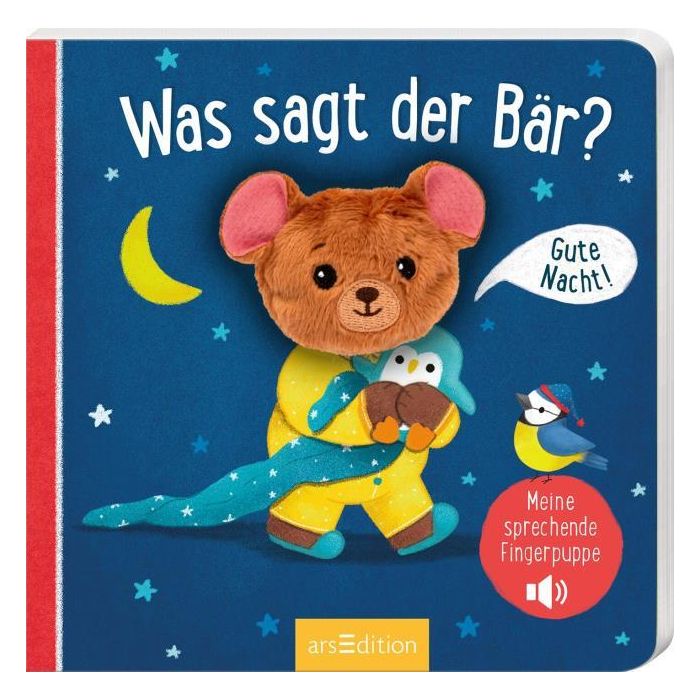 Wer spricht denn da? Es ist der kleine Bär! Die niedliche Fingerpuppe spricht und gähnt, wenn man sie bewegt und lässt kleine Kinderaugen leuchten. Ein interaktives Vorleseerlebnis zum beliebten Thema „Gute Nacht“ für Kleinkinder ab 12 Monaten. Da staunen nicht nur die Kleinsten!