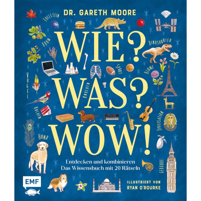 Entdecken, benennen, lernen - spannendes Sachwissen und lustige Rätsel Wie? Was? Wow! In diesem Wissensbuch warten 20 Bildrätsel auf dich. Teste dein Wissen und entdecke beliebte Themenbereiche wie Musik, Sport, Hunderassen, Dinosaurier und Co. Spannendes Sachwissen für neugierige Kids ab 5 Jahren20 Rätsel und kuriose Fakten Kindgerechte und detailreiche Illustrationen Mit praktischen Lösungsseiten zur einfachen Selbstkontrolle Was ist der Unterschied zwischen einem Tyrannosaurus rex und einem Triceratops? Wie sieht ein Schlüsselbein aus und wie ein Schulterblatt? Welche Flagge gehört zu welchem Land? Entdecke spannendes Sachwissen in 20 beliebten Themenbereichen : Bäume, Forscher*innen, Zivilisationen, Vögel, Reptilien, Essen, Gewürze, Bauwerke, Länder, Berufe und vieles mehr. Praktische Lösungsseiten helfen dir bei der einfachen Selbstkontrolle . Das perfekte Geschenk für neugierige Kids ab 5 Jahren.